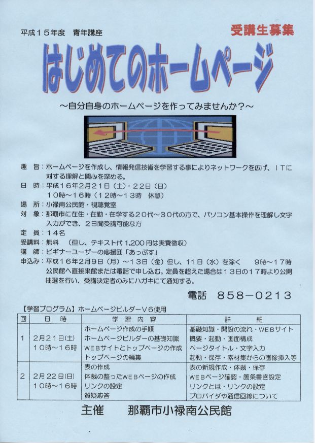はじめてのホームページ 2004年2月23日2015年10月24日 kobuta 那覇市小禄南公民館主催 2004/2/21(土)~22(日) 講座風景1 講座風景2 募集チラシ1 共有: クリックして友達にメールでリンクを送信 (新しいウィンドウで開きます) メールアドレス クリックして X で共有 (新しいウィンドウで開きます) X クリックして Bluesky で共有 (新しいウィンドウで開きます) Bluesky 関連