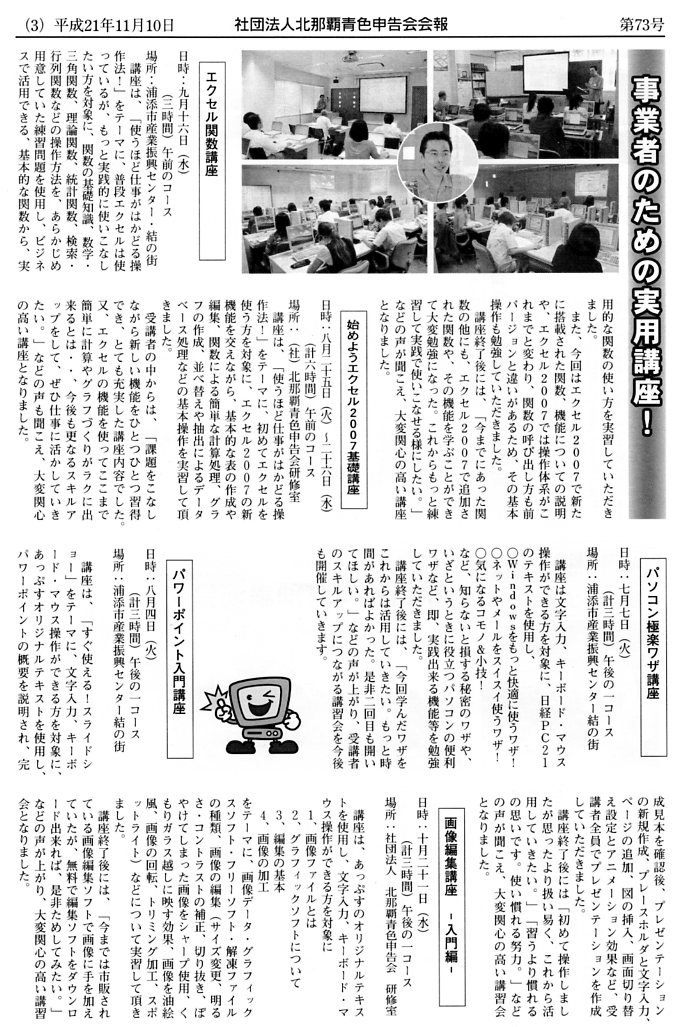 日ごろパソコン講習会を始め、確定申告やその他でお世話になっている社団法人北那覇青色申告会の会報誌第73号で、1ページにわたり記事が掲載されました。