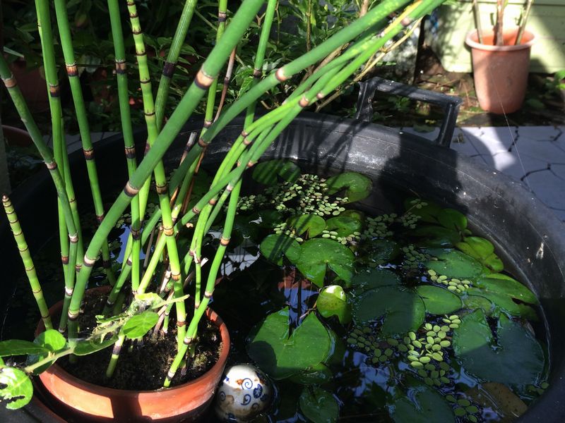 鉢は水面に触れるよう吊るしているのですが、水中にはメダカ、赤ヒレ、エビ、石巻貝も同居しています 😉