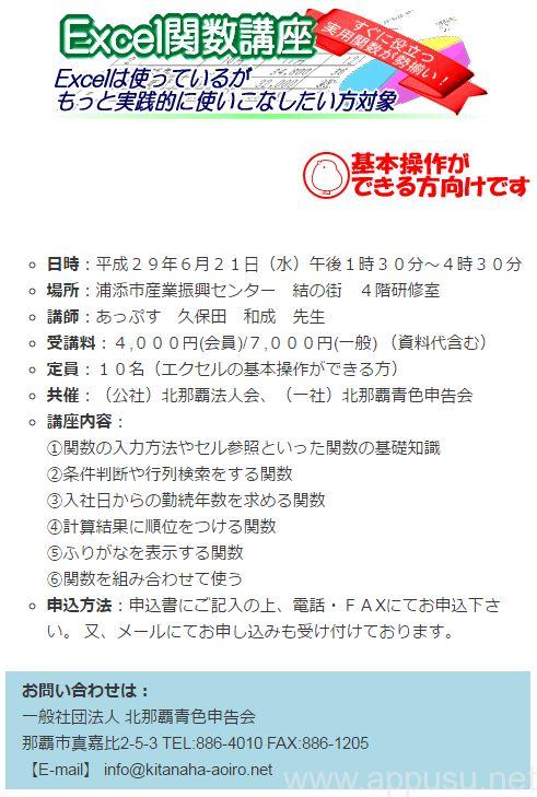 一般社団法人北那覇青色申告会 & 公益社団法人北那覇法人会の主催するExcel関数講座’17を予定しています。