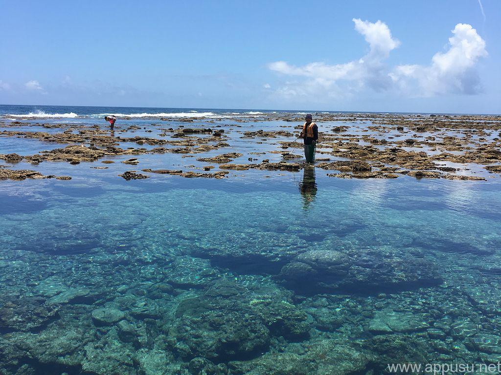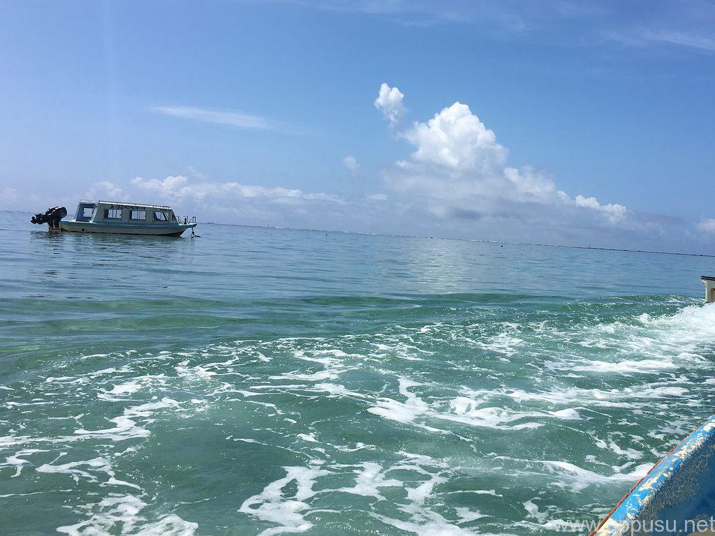 干潮の時間に合わせて,ビーチからボートで沖のリーフまで移動し