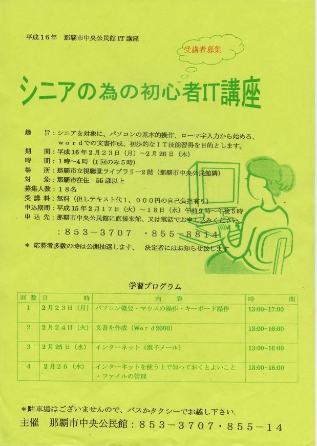 商業者のためのワープロ実践講座 2004年2月20日2015年10月24日 Source Author 那覇市経済観光部商工振興課 なはの街活性化室主催 2004/2/2(月)~9(月) Word2000を使ってお店のチラシ作り 講座風景1 講座風景2 講座風景3