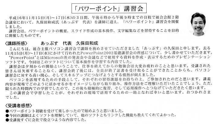 会報に掲載! 2004年12月15日2015年10月24日 Source Author 日ごろ講座依頼でお世話になっている沖縄県卸商業団地協同組合の会員向け機関誌に前月実施講座の所感を書かせていただきました。
