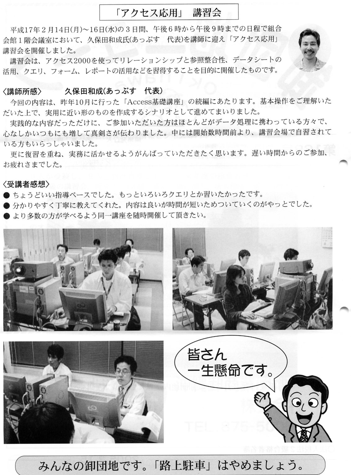 会報に掲載! 2005年3月15日2015年10月24日 Source Author 日ごろ講座依頼でお世話になっている沖縄県卸商業団地協同組合の会員向け機関誌に前月実施講座の所感を書かせていただきました。