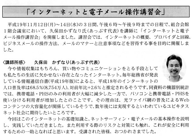 会報に掲載! 2007年12月17日2015年10月24日 Source Author 日ごろ講座依頼でお世話になっている沖縄県卸商業団地協同組合の会員向け機関誌[卸団地ニュース第201号]にインターネット&電子メール入門講座の所感を書かせていただきました。 😆