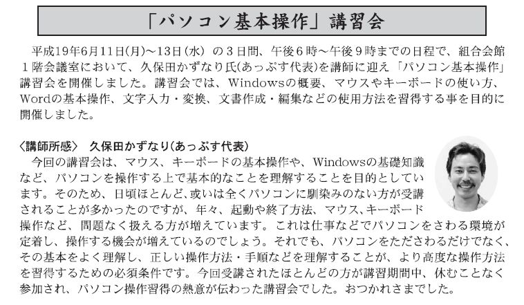 会報に掲載! 2007年7月15日2015年10月24日 Source Author 日ごろ講座依頼でお世話になっている沖縄県卸商業団地協同組合の会員向け機関誌[卸団地ニュース第196号]にパソコン入門講座の所感を書かせていただきました。 [amjsc] \[amazonjs asin=4893114336\] [/amjsc]