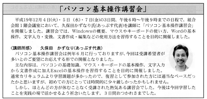 会報に掲載! 2008年1月21日2015年10月24日 Source Author 日ごろ講座依頼でお世話になっている沖縄県卸商業団地協同組合の会員向け機関誌[卸団地ニュース第202号]にパソコン基礎講座の所感を書かせていただきました。 😆