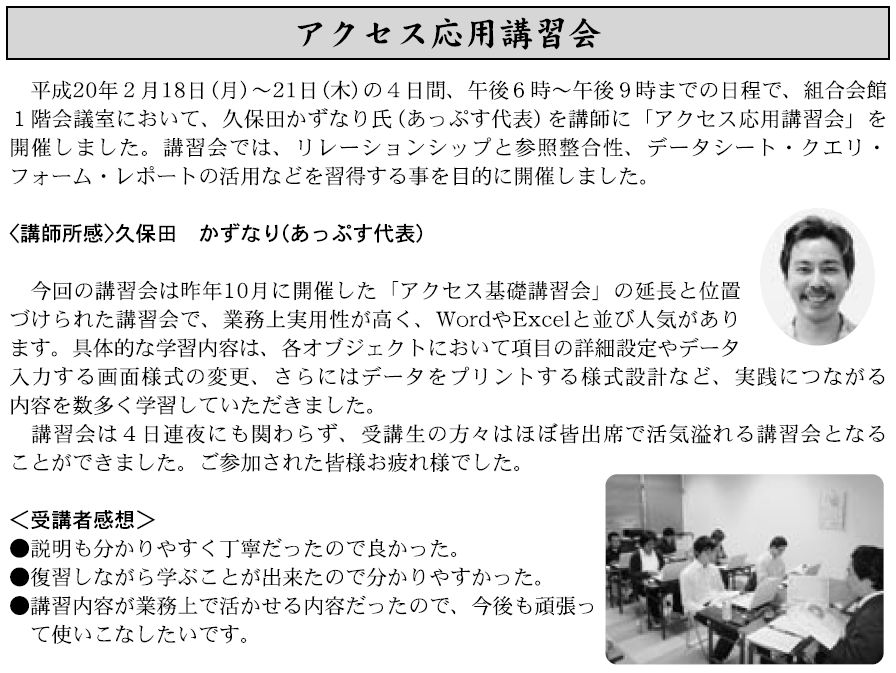 会報に掲載! 2008年3月20日2015年10月24日 Source Author ごろ講座依頼でお世話になっている沖縄県卸商業団地協同組合の会員向け機関誌[卸団地ニュース第204号]にAccess2003応用講座の所感を書かせていただきました。 😆
