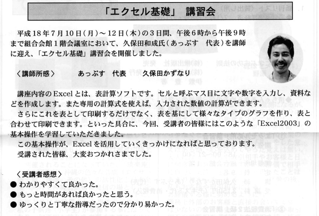 会報に掲載! 2006年8月15日2015年10月24日 Source Author 日ごろ講座依頼でお世話になっている沖縄県卸商業団地協同組合の会員向け機関誌に前月実施講座の所感を書かせていただきました。